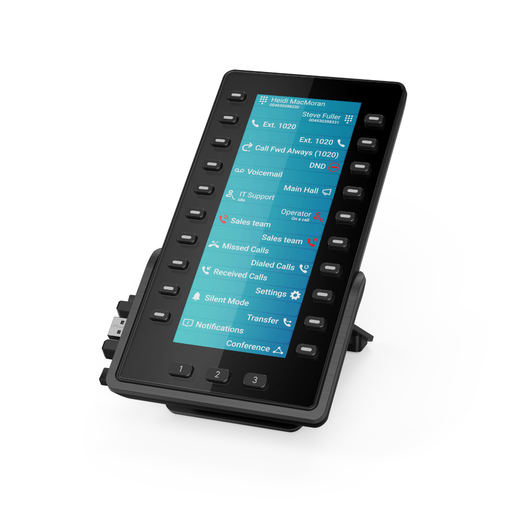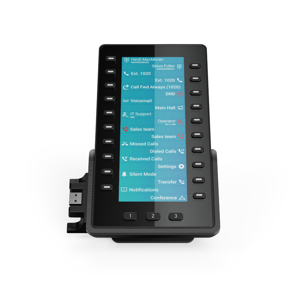 20個の物理キー(仮想キーを含め60キー)を自由にプログラム可能で、マルチカラーLEDにより同僚のステータスを素早く確認したり、通話を即座に転送することができます。対応するラインやLEDが赤または黄色に点灯している場合、その相手は不在または通話中を示します。